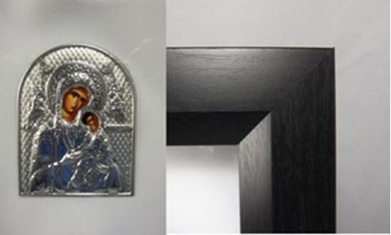 This is classic yet contemporary. The stefanothiki is made of a dark black/brown wood, plain and simple. The interior holds a beautiful sterling silver icon of the Virgin Mary (Panagia), centered on a white satin backing. Measures approximately 11 5/8 x 11 5/8 inches. It is secured with a magnetic catch, which opens with ease.