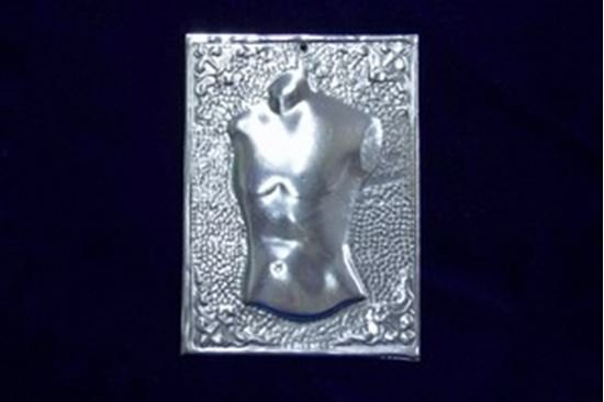 A small metal (silver or gold) rectangle, called a tama or an aphieroma, embossed with a facsimile of a male torso to be placed on the church altar or in front of the church icons.  A tama combines a personal prayer and a vow to a saint while appealing for help or assistance. The petitioner vows to give or do something as he/she prays to a saint in times of need.
